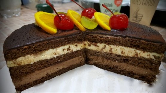 Масляный шоколадный бисквит с какао, прослойка на основе черного шоколада, апельсиновый мусс.